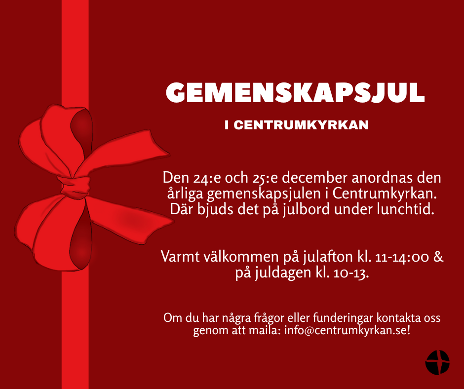 Under den 24:e och 25:e december öppnar vi upp för den årliga gemenskapsjulen i Centrumkyrkan, där vi vill göra julen lite varmare för fler! Det kommer bjudas på julmat och trevlig stämning.