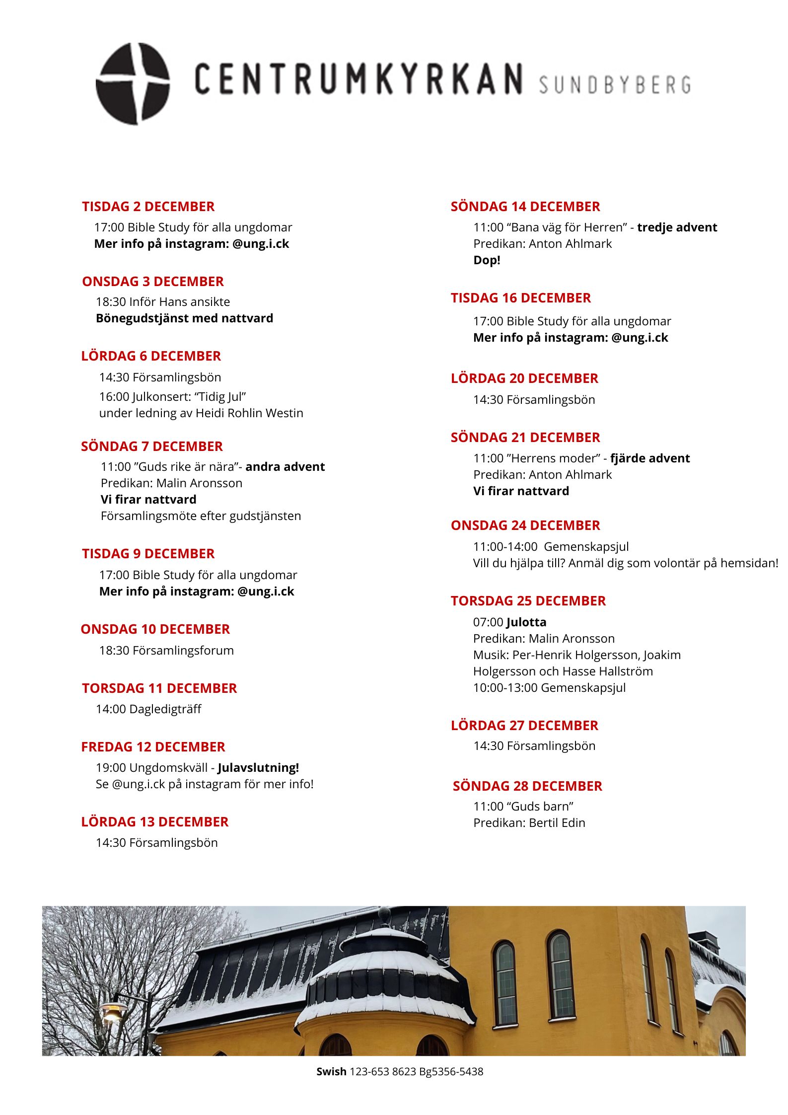 Tisdag 2 december: kl. 17:00 Bibelstudie för alla ungdomar. Mer info på instagram: @ung.i.ck
